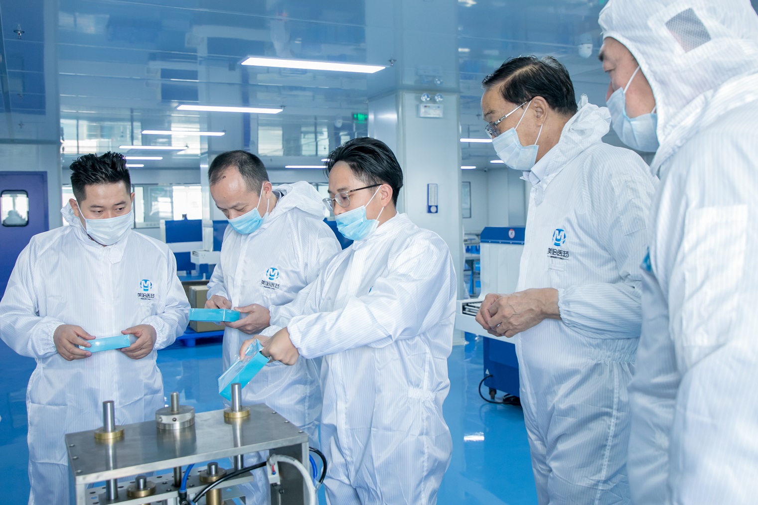 接着,在美哈医药董事长陈信杰的带领下,又来到了我司净化生产车间进行考察,陈信杰向领导们讲解了整个净化车间生产线模块的制作和装配流程,对于整个制作的过程张凤楼副部长给予了极大的赞许。